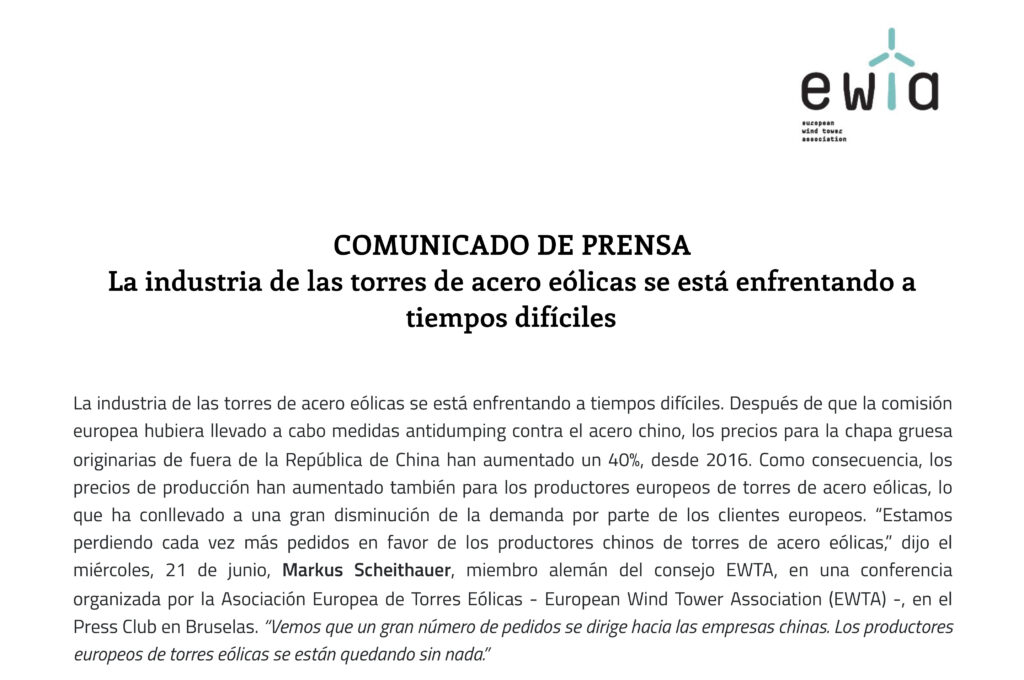 Europe’s wind steel tower industry is facing difficult times. After the EU Commission took anti-dumping measures on Chinese steel, prices for heavy plate originating from outside the People’s Republic of China have increased by 40% since 2016. As a consequence, European wind steel tower producers production costs have increased, leading to a drop in the demand from European customers. “We’re losing more and more orders to Chinese wind tower producers,” said Markus Scheithauer from Germany, EWTA board member, on Wednesday June 21st at a conference organized by the European Wind Tower Association (EWTA) at the Press Club in Brussels. “We see the large orders go to the Chinese companies. Wind tower producers in Europe are being left with almost nothing.”